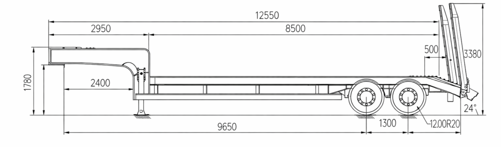 Engineered for transporting heavy equipment, this two-axle low bed trailer offers a 40-ton load capacity with hydraulic ramps for seamless loading and unloading operations.